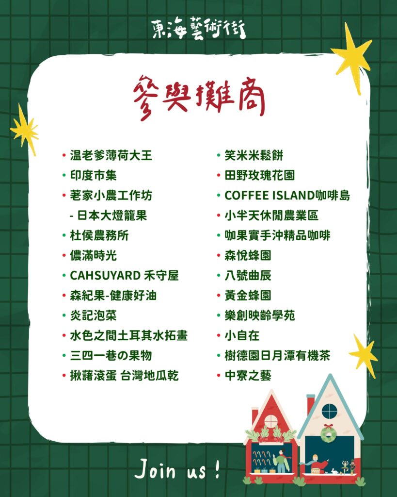 🌜時間:12/25|11:00–16:00🌜地點:東海藝術街-科比意廣場 (龍井區藝術街48-70號)