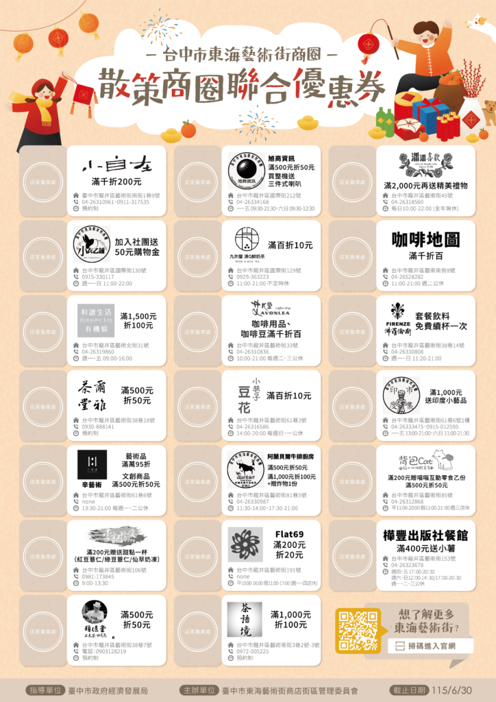 東海藝術街商圈店家新春優惠🧨 新春佳節到來,邀請大家來東海藝術街商圈! 新春佳節到來,東海藝術街商圈邀請大家一起過年走春、感受滿滿年味!多家特色店家推出限定新春優惠🧨從美食、茶飲到生活選物,逛街同時享好康。漫步東海藝術街,品味在地風情,吃好、買好、玩得開心,和親朋好友一起迎接嶄新的一年,讓新春從東海藝術街開始更熱鬧、更有溫度❤️ 按笑臉,看更多活動消息與影音,追蹤我們的粉絲專頁! 台灣台中市東海藝術街商圈 逃逃2026-02-05T21:42:02+08:00
